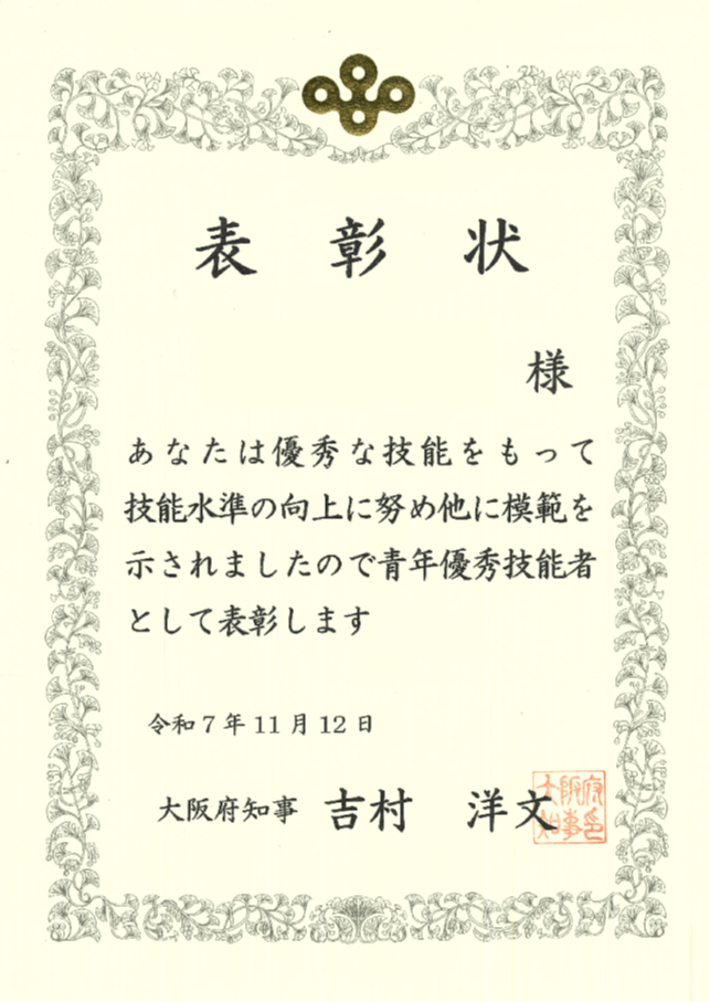 弊社社員が「大阪府優秀技能者(なにわの名工)」として表彰されました。こちら